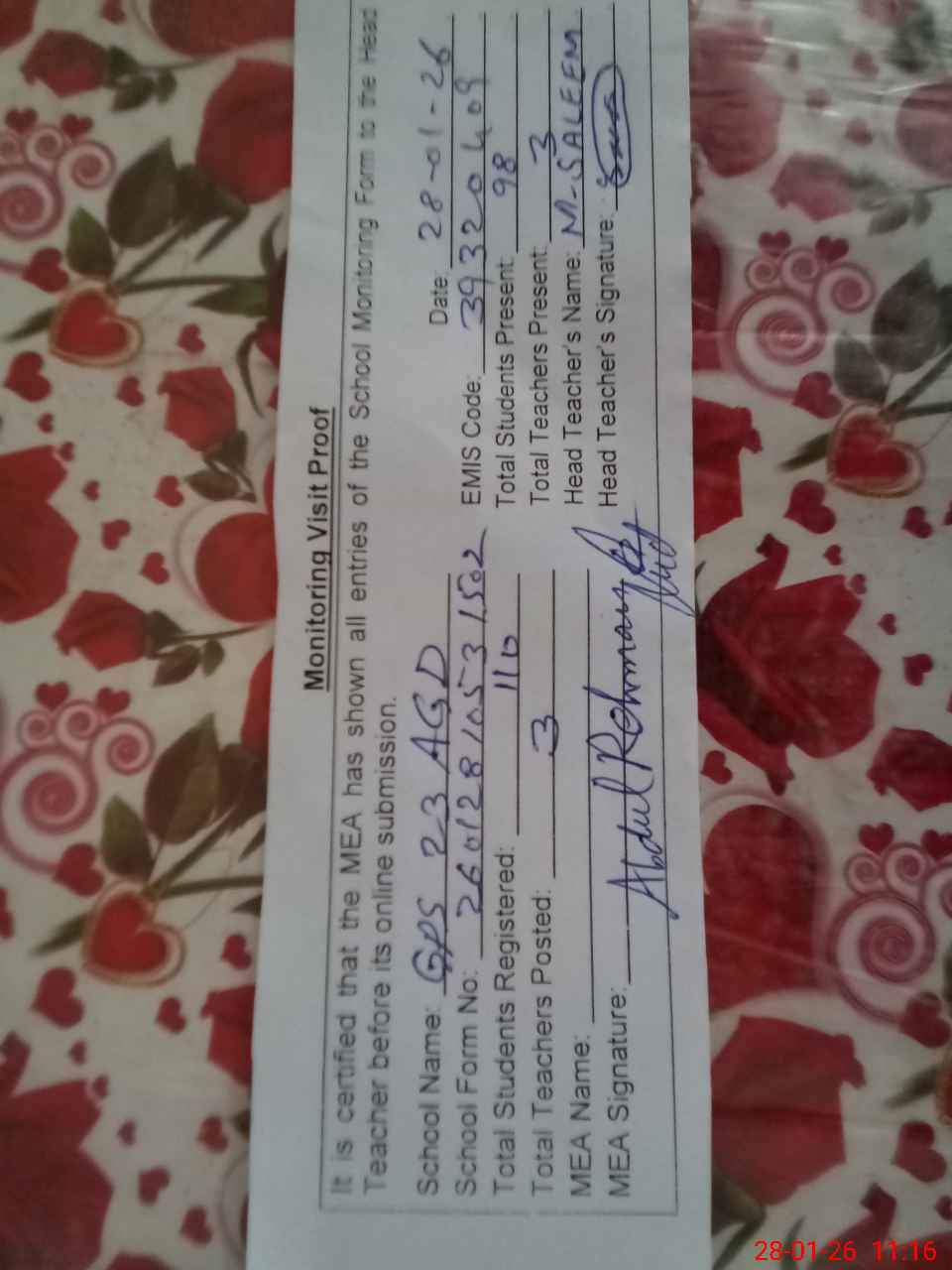 | Attendance Register | Head Teacher | MEA with School | Visit Proof |