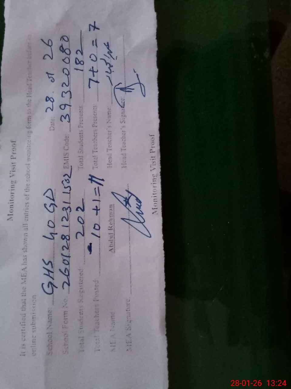 | Attendance Register | Head Teacher | MEA with School | Visit Proof |