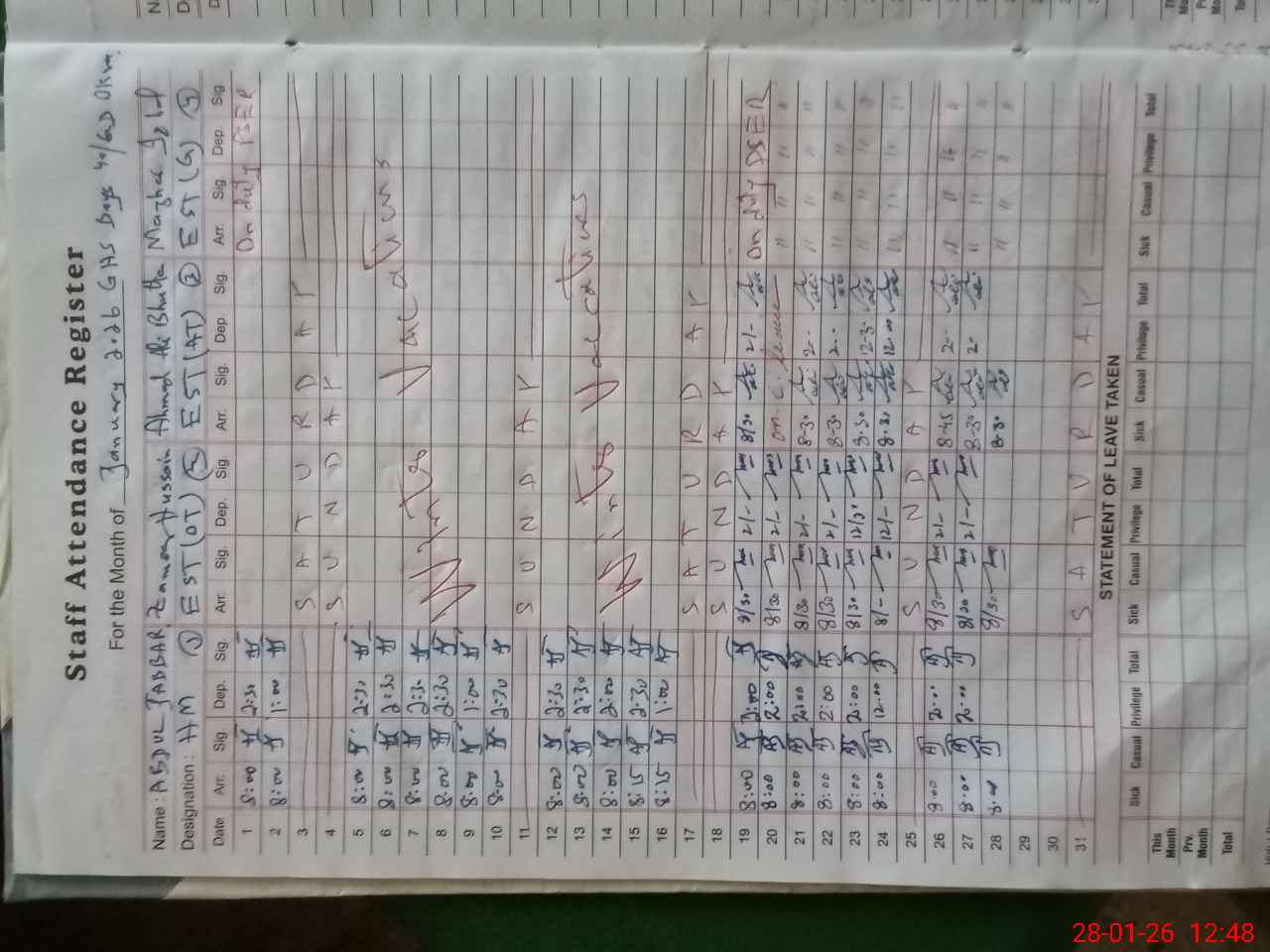 | CNIC | Full Name | Designation | R/C | Absence During Last Calender Month |