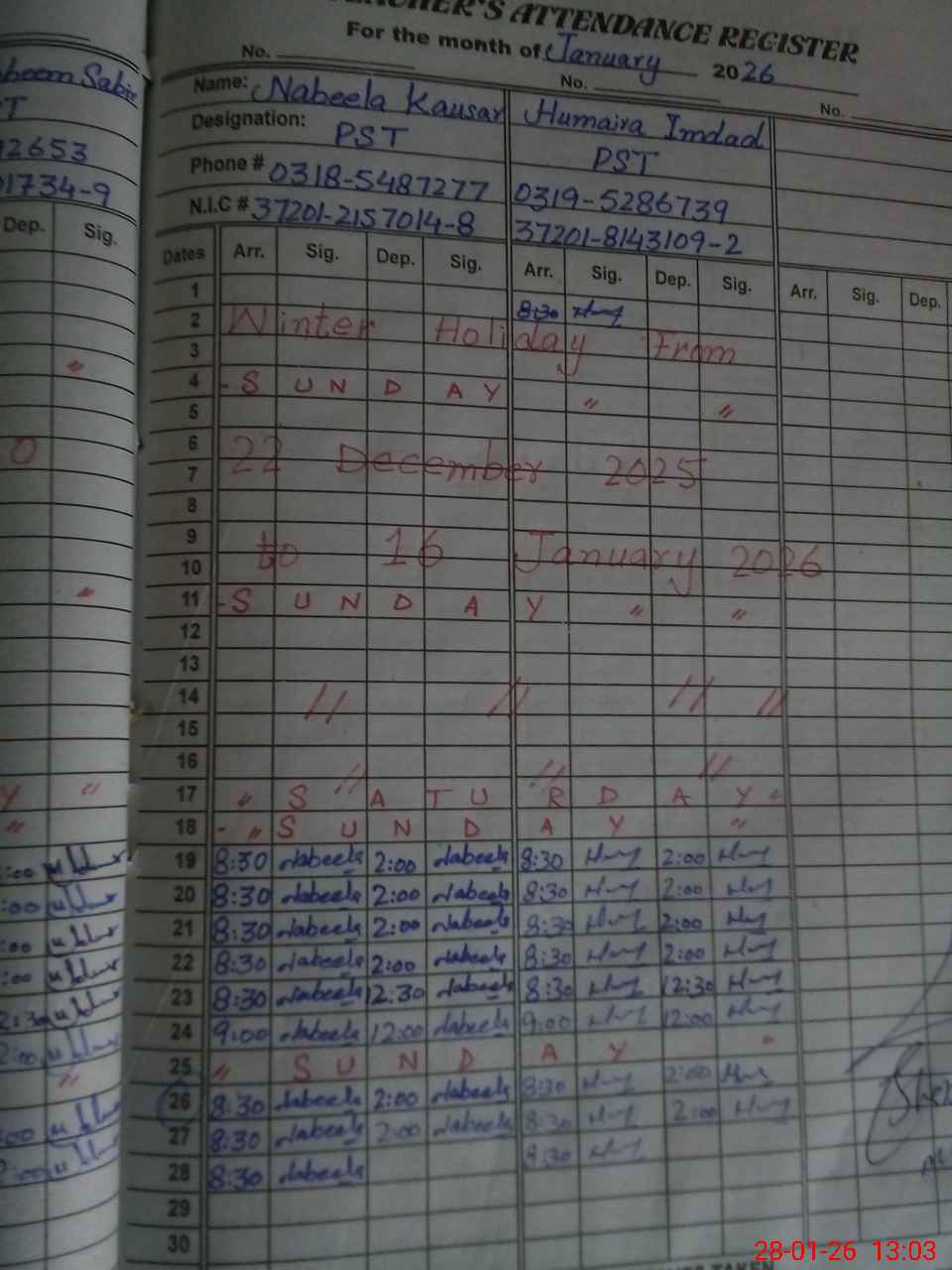 | CNIC | Full Name | Designation | R/C | Absence During Last Calender Month |