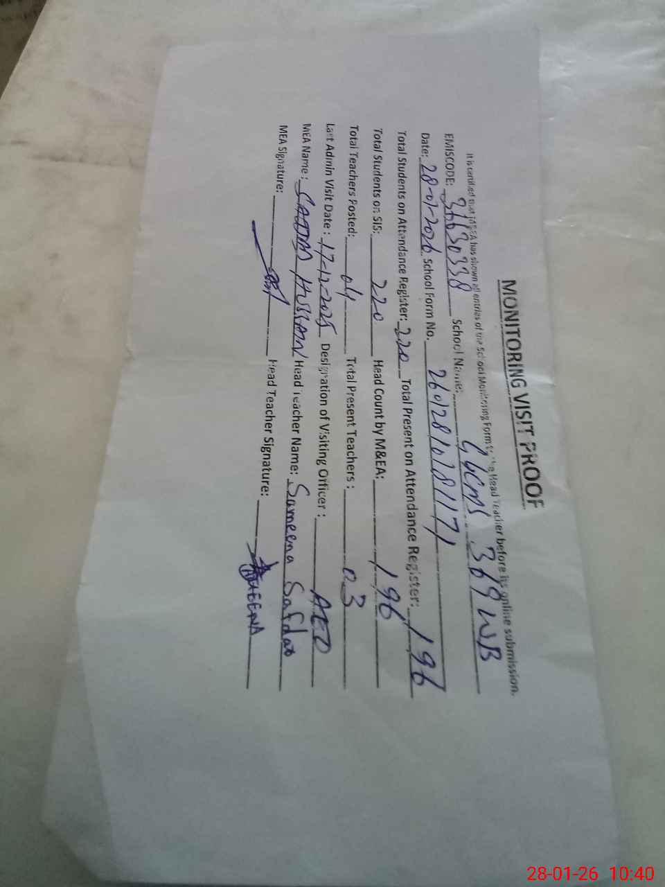 | Attendance Register | Head Teacher | MEA with School | Visit Proof |