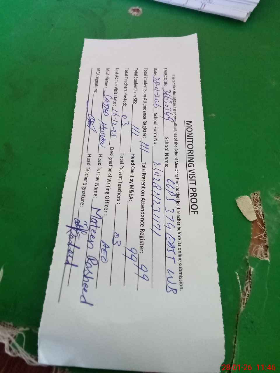 | Attendance Register | Head Teacher | MEA with School | Visit Proof |