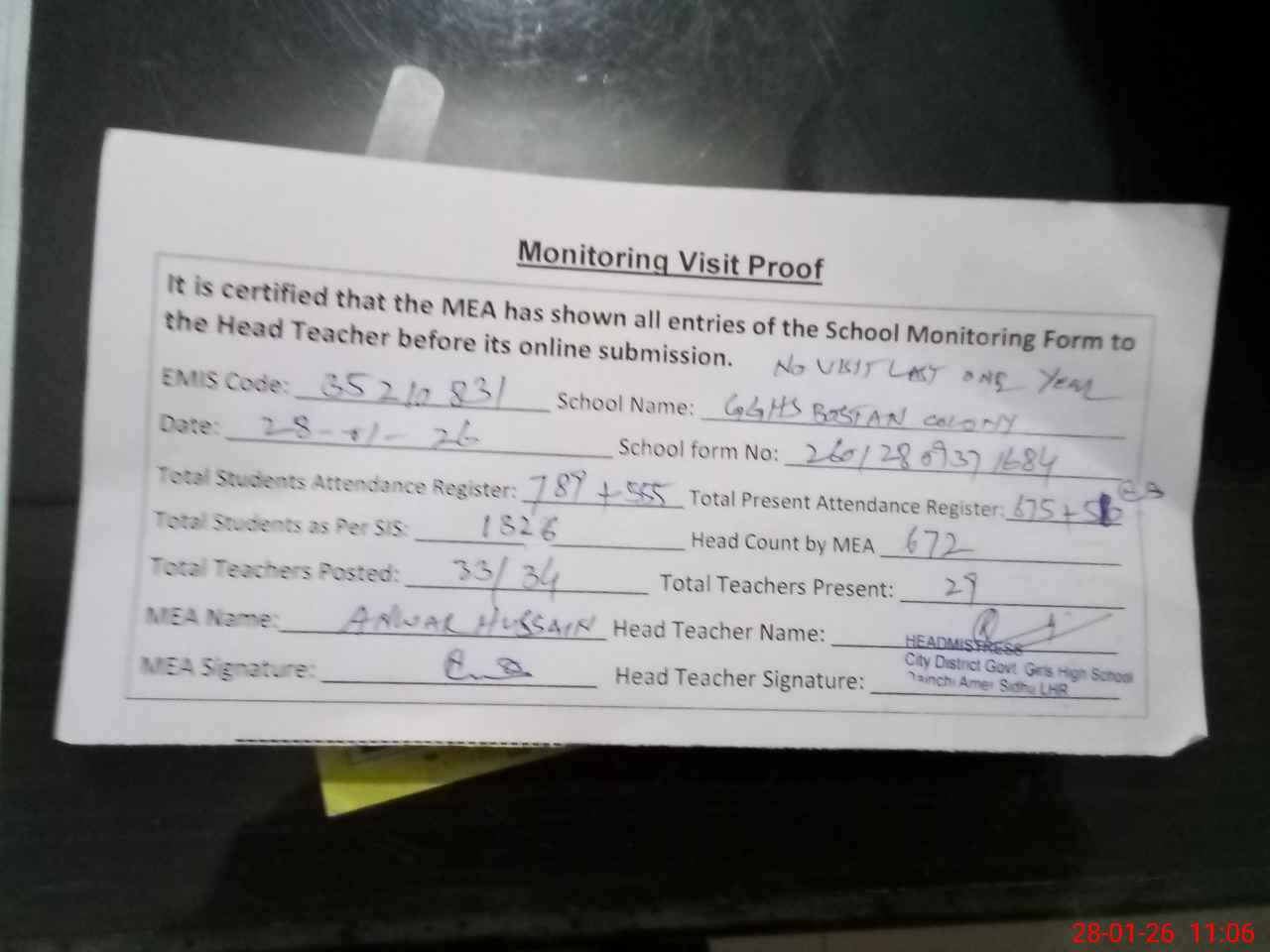 | Attendance Register | Head Teacher | MEA with School | Visit Proof |