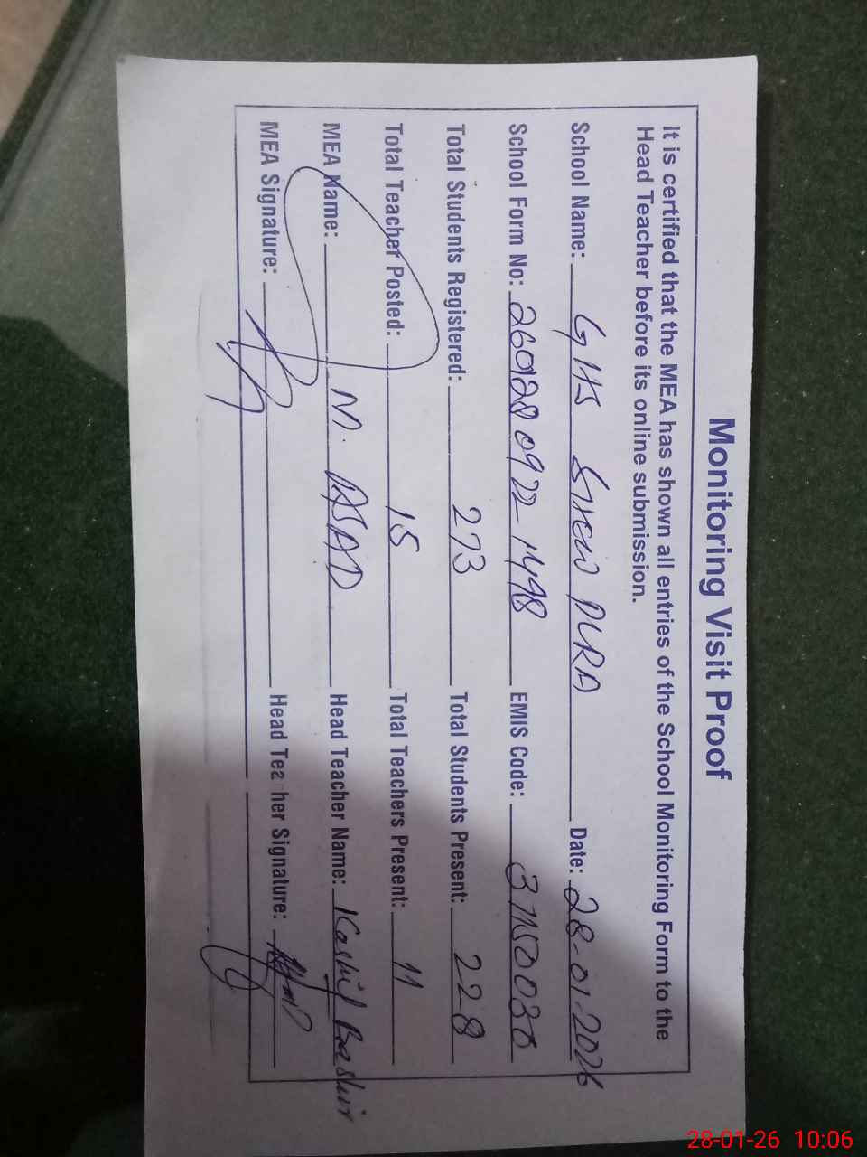| Attendance Register | Head Teacher | MEA with School | Visit Proof |
