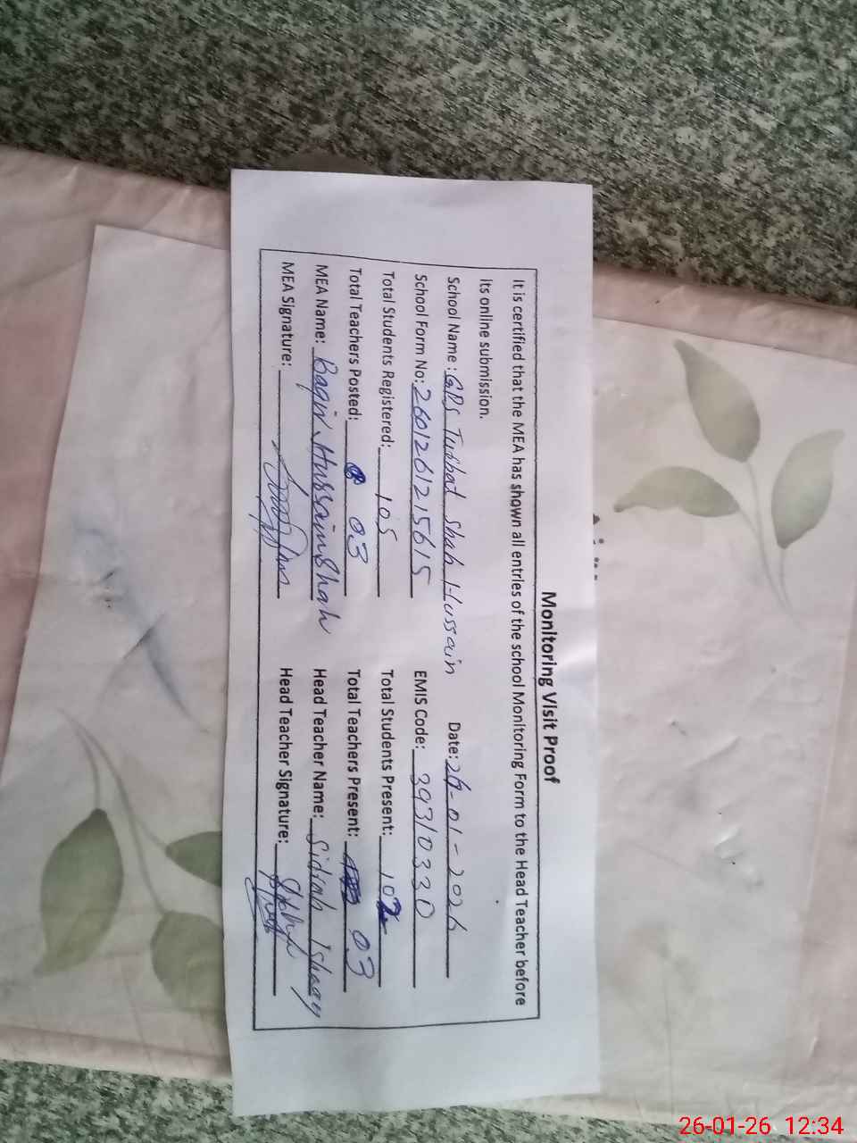 | Attendance Register | Head Teacher | MEA with School | Visit Proof |