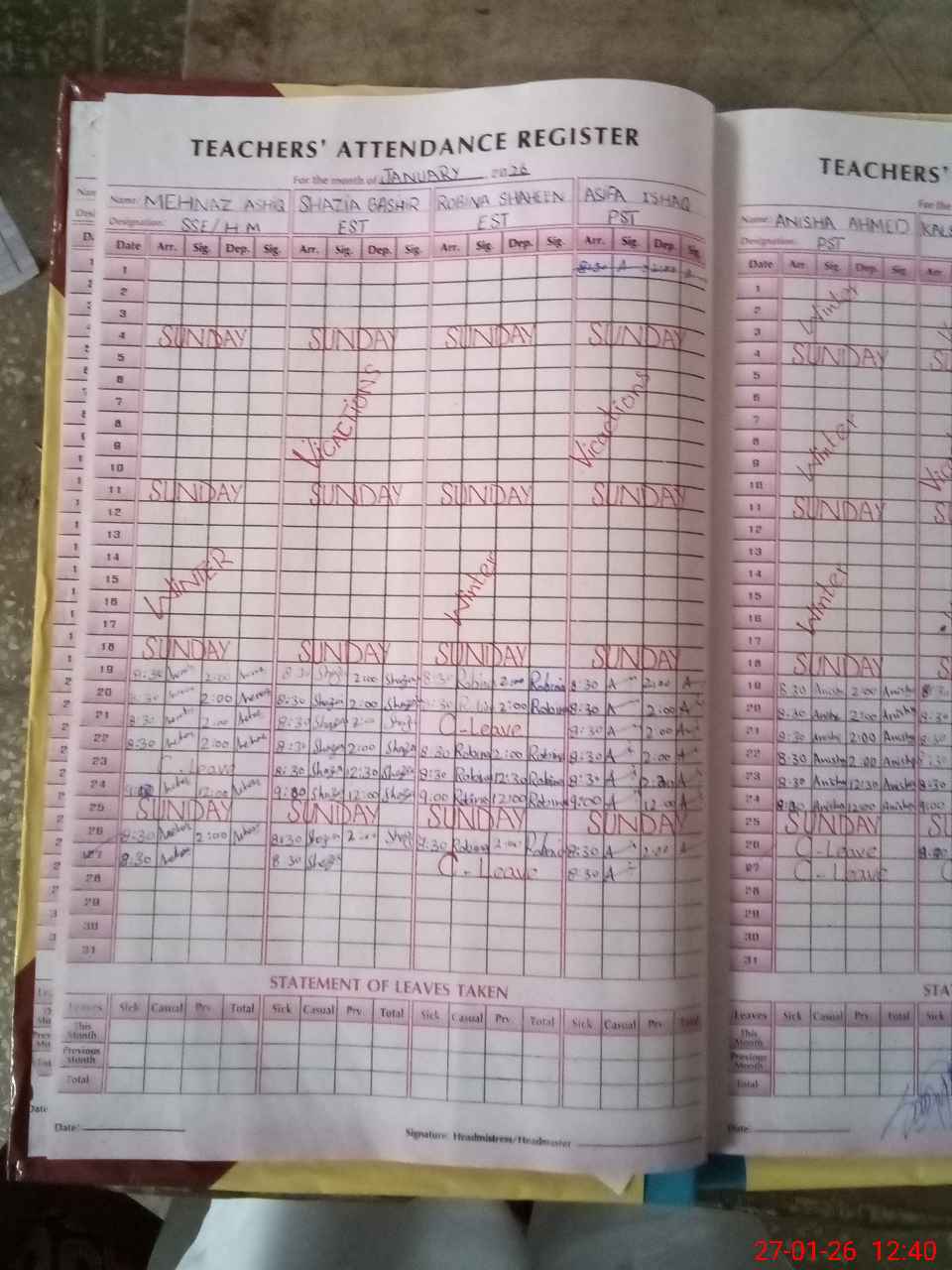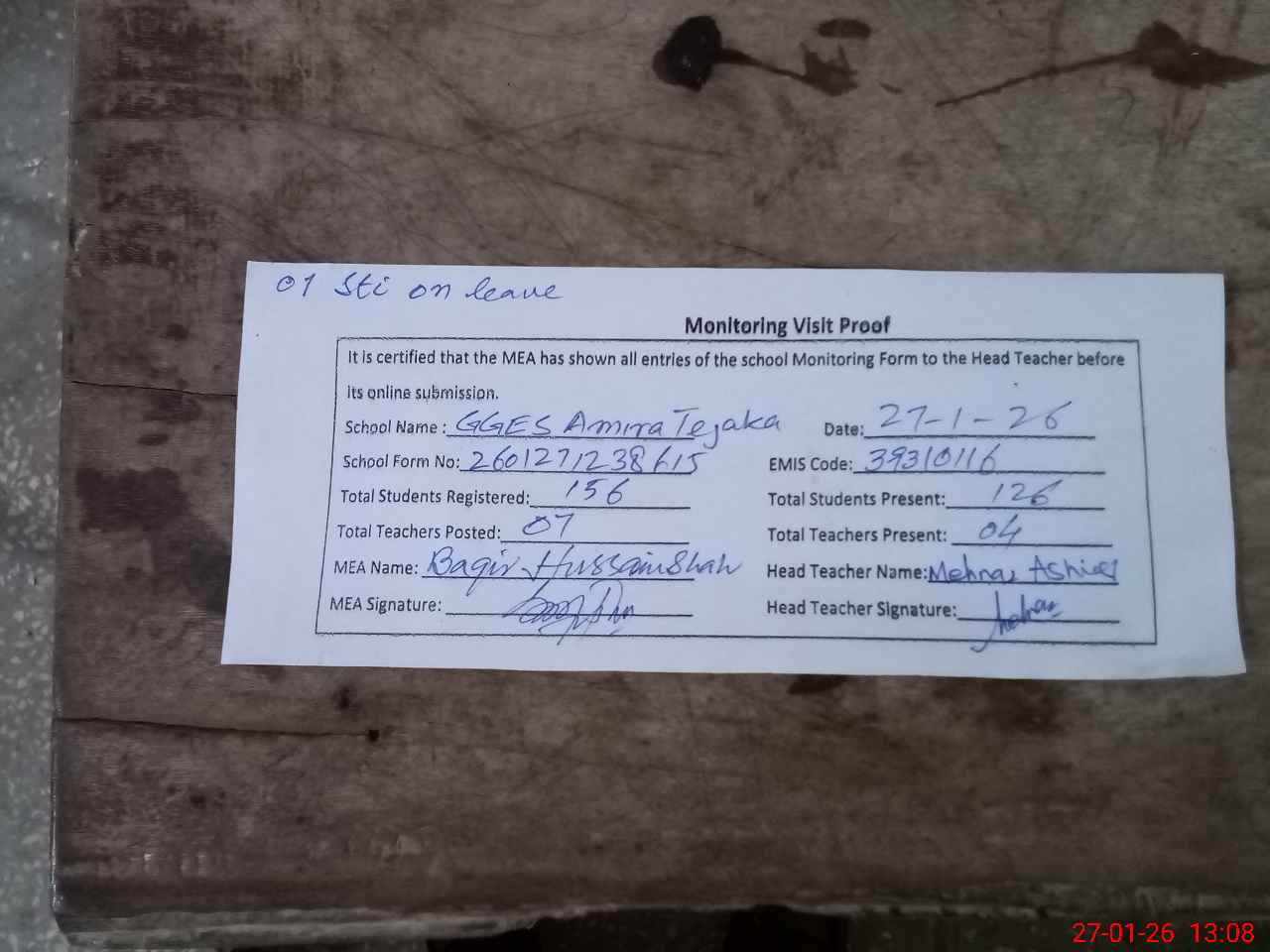 | Attendance Register | Head Teacher | MEA with School | Visit Proof |