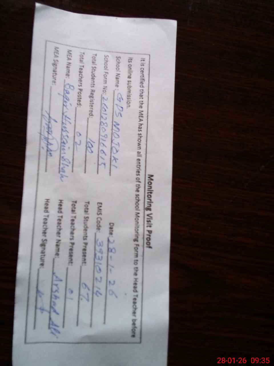 | Attendance Register | Head Teacher | MEA with School | Visit Proof |