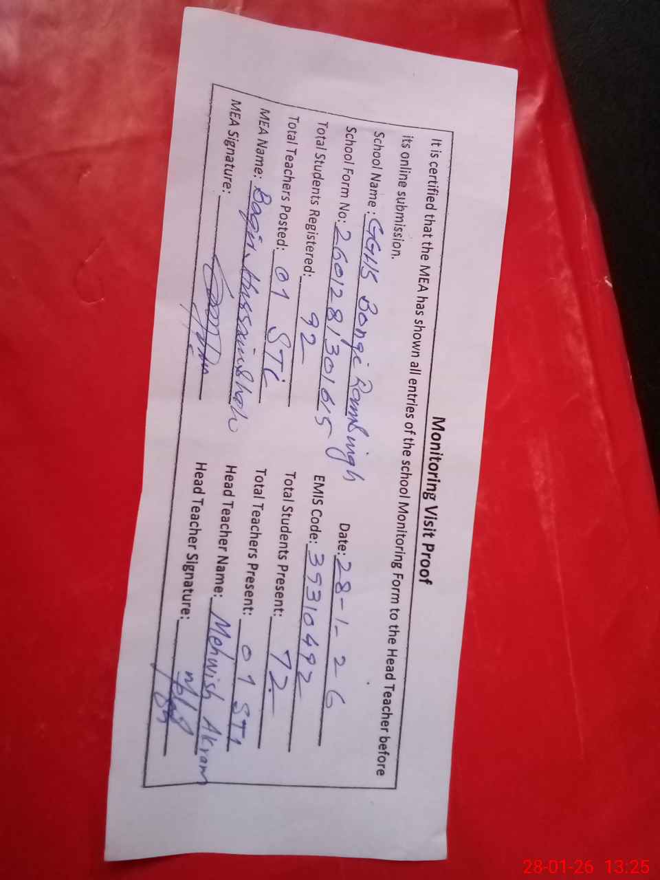 | Attendance Register | Head Teacher | MEA with School | Visit Proof |