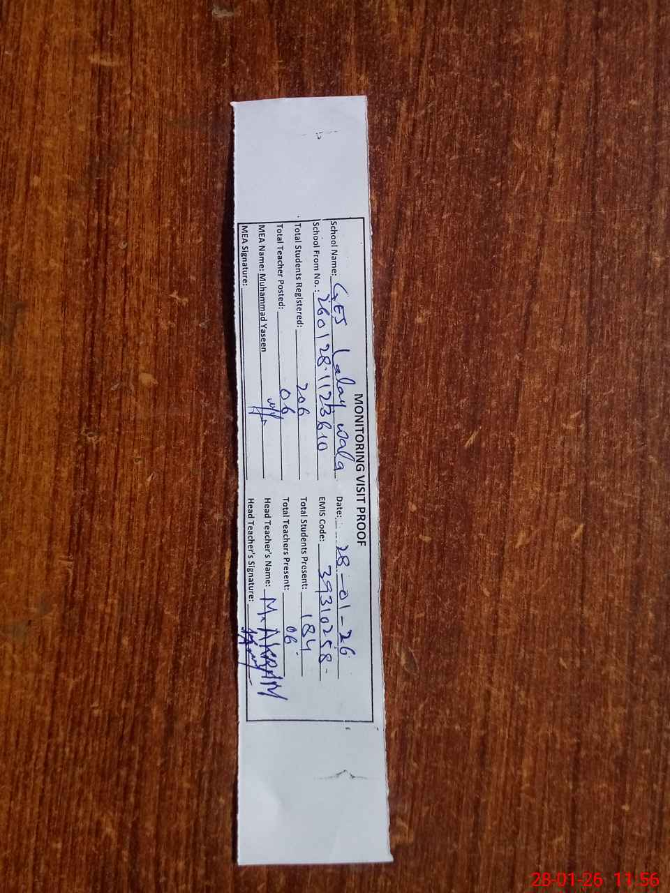 | Attendance Register | Head Teacher | MEA with School | Visit Proof |