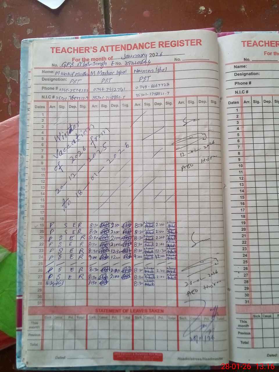 | CNIC | Full Name | Designation | R/C | Absence During Last Calender Month |