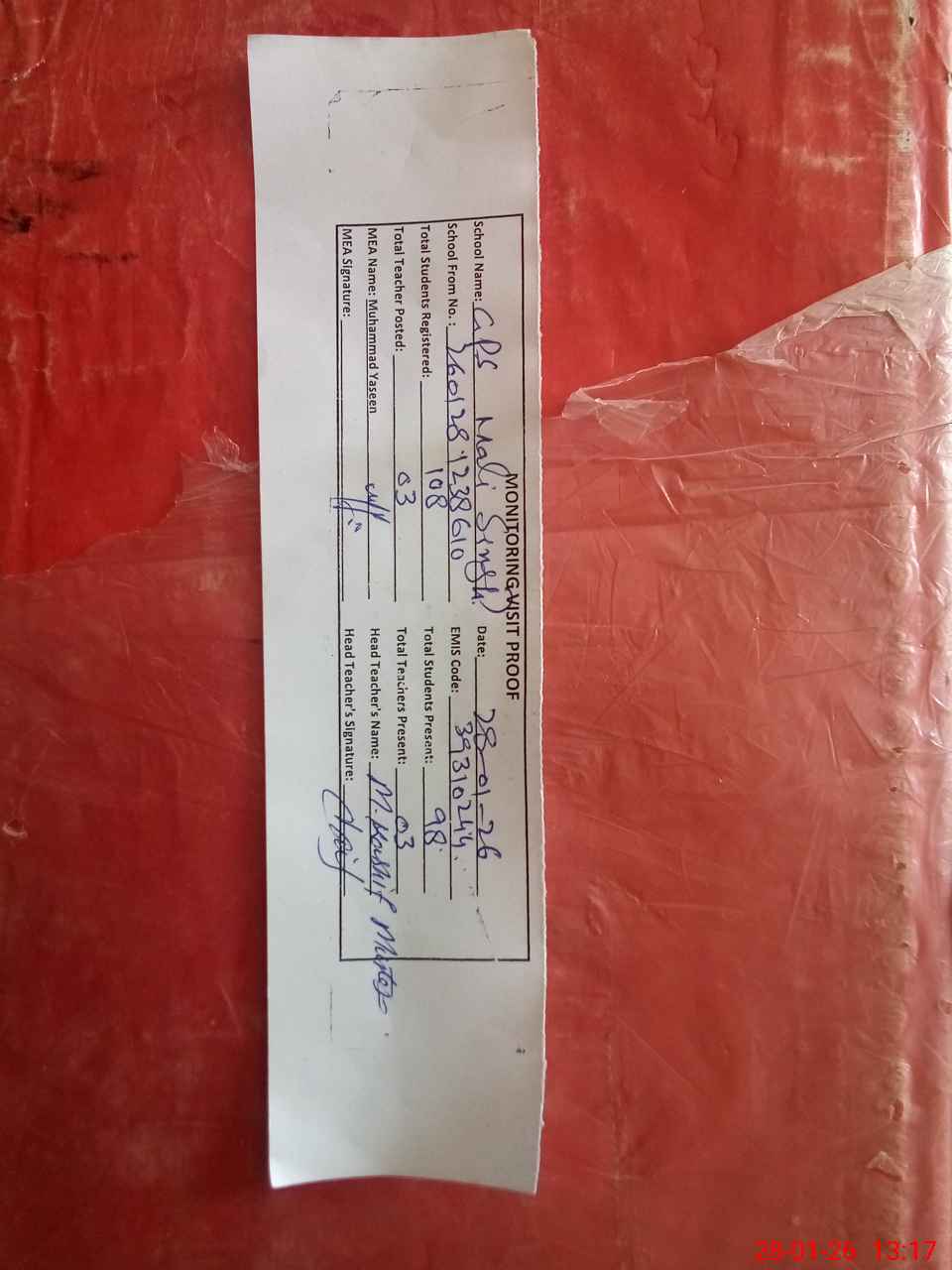 | Attendance Register | Head Teacher | MEA with School | Visit Proof |