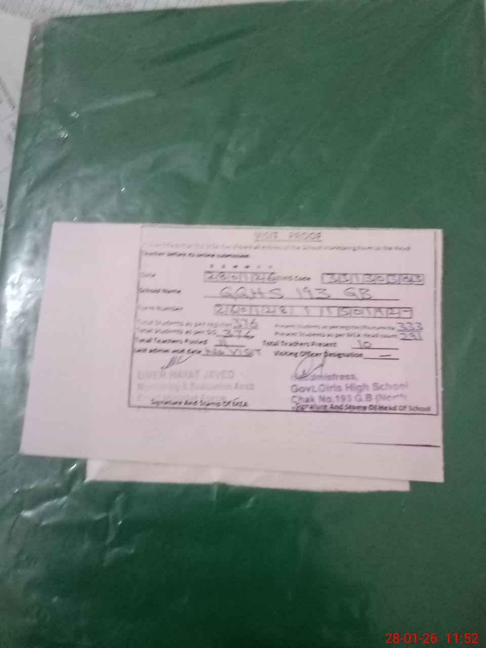 | EMIS Code: 33130383 | Name of School: GGHS CHAK NO 193 GB N | |||