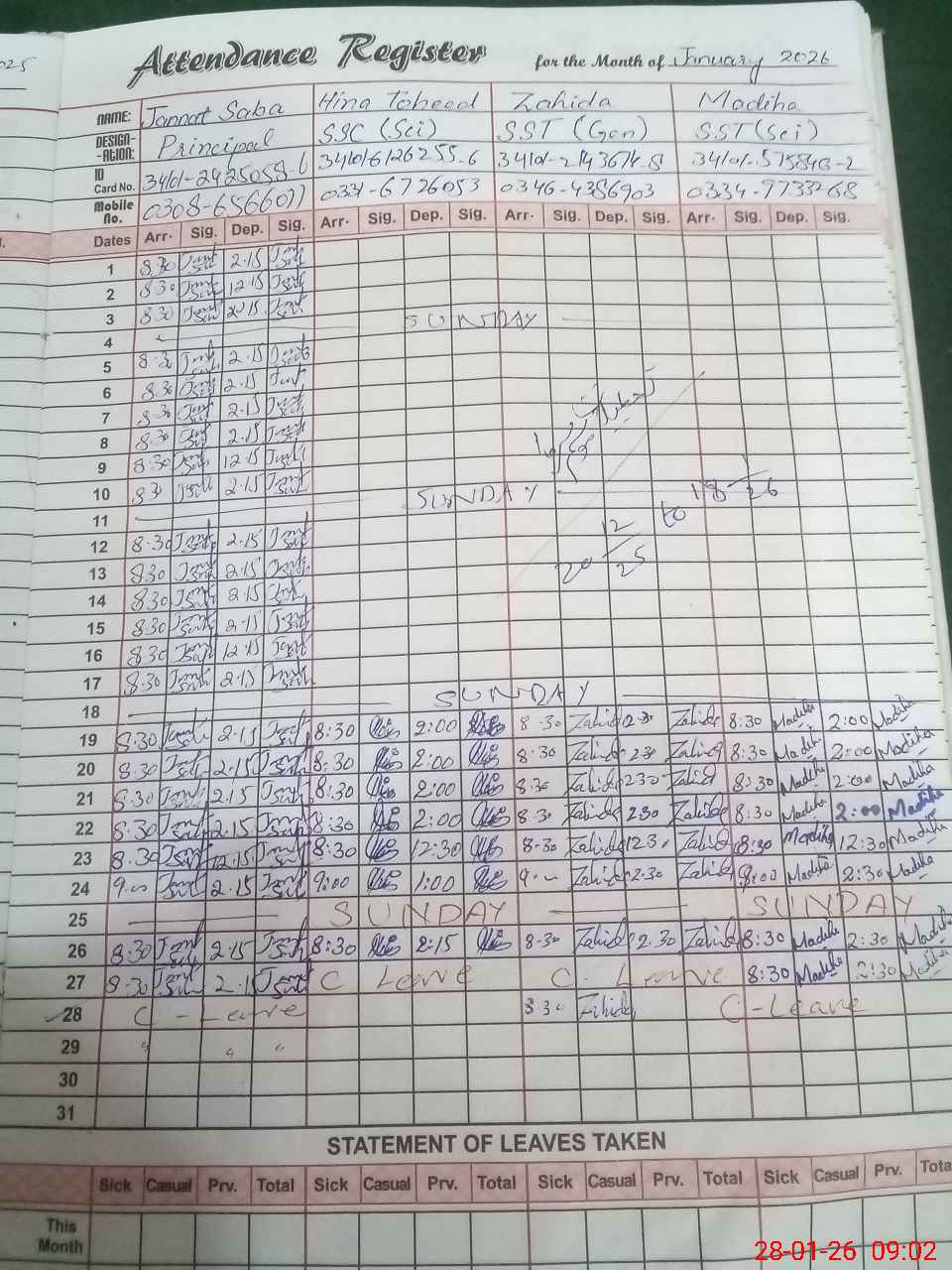 | 34**** | Ja**** Sa**** | PRINCIPAL | Regular | 1 | 0 | 0 | 0 | 0 | 0 | 0 | 0 | 1 | Absent (Un-Authorized) |