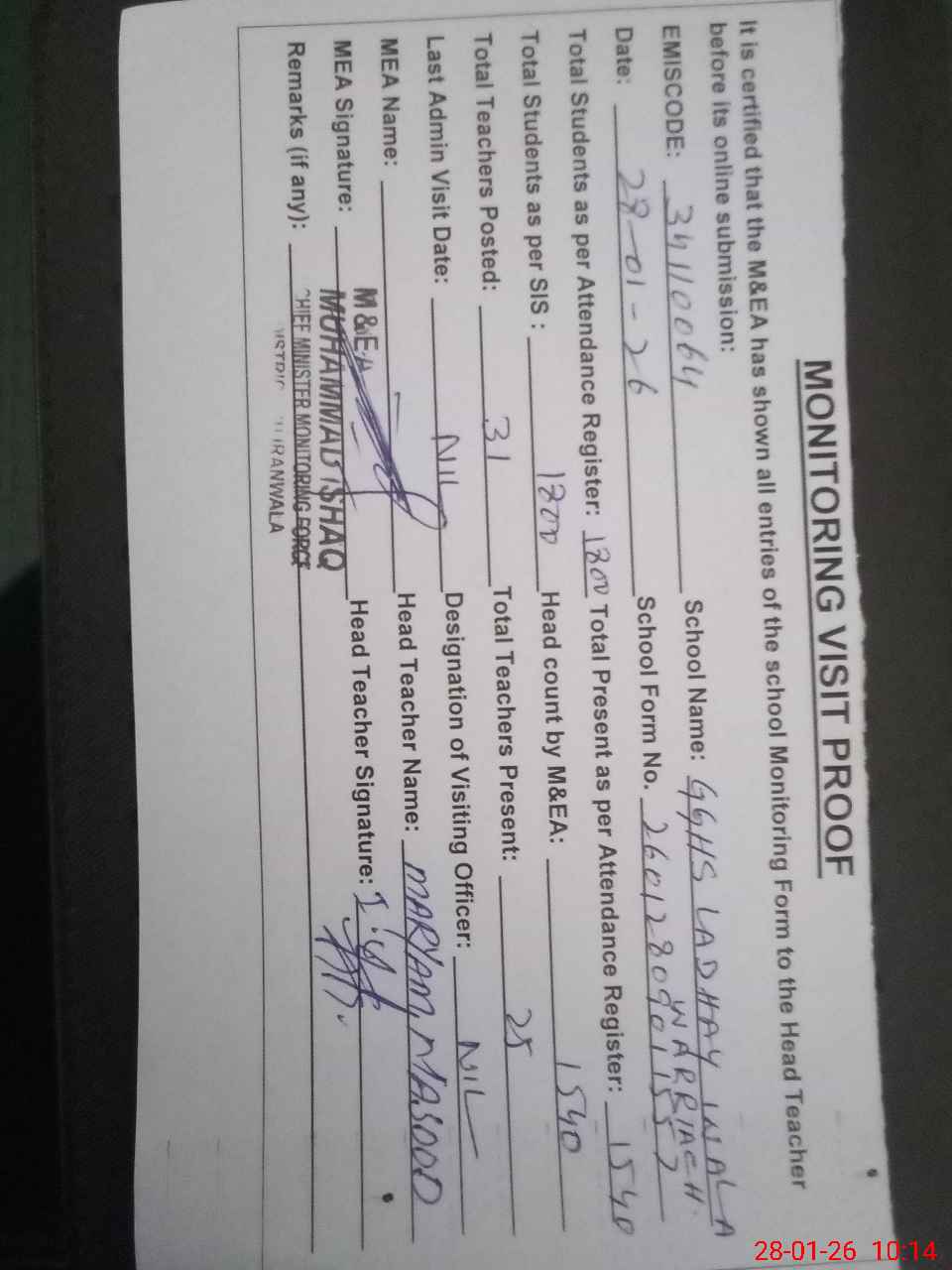 | EMIS Code: 34110064 | Name of School: GGHS LADHAY WALA WARRIACH | |||