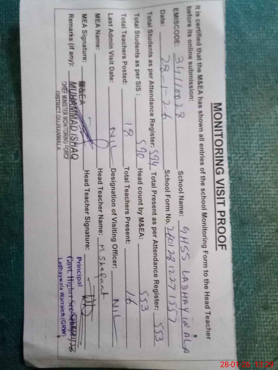 | EMIS Code: 34110028 | Name of School: GHSS LADHAY WALA WARRIACH | |||