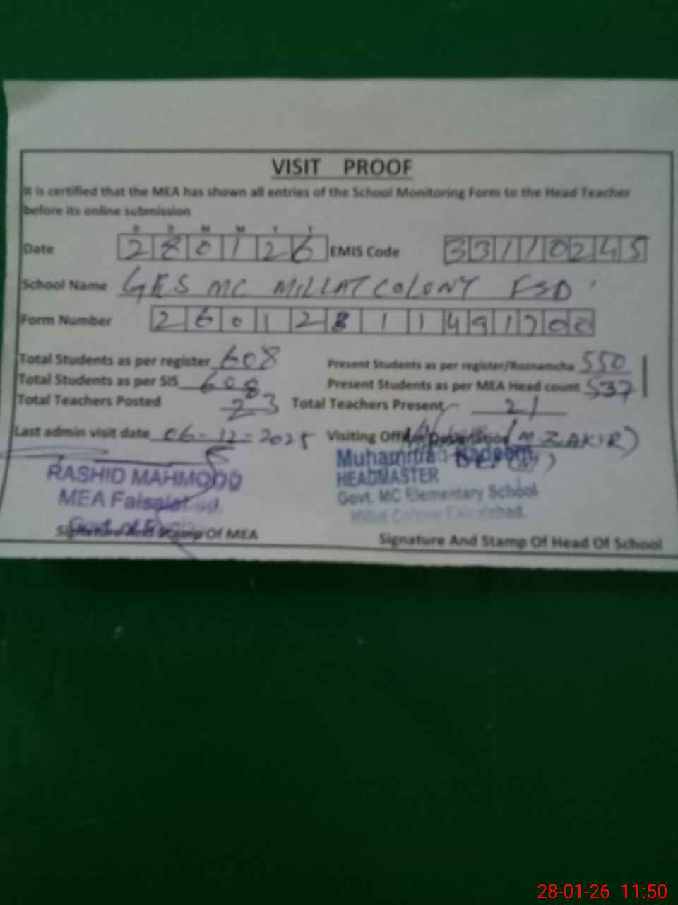 | Attendance Register | Head Teacher | MEA with School | Visit Proof |