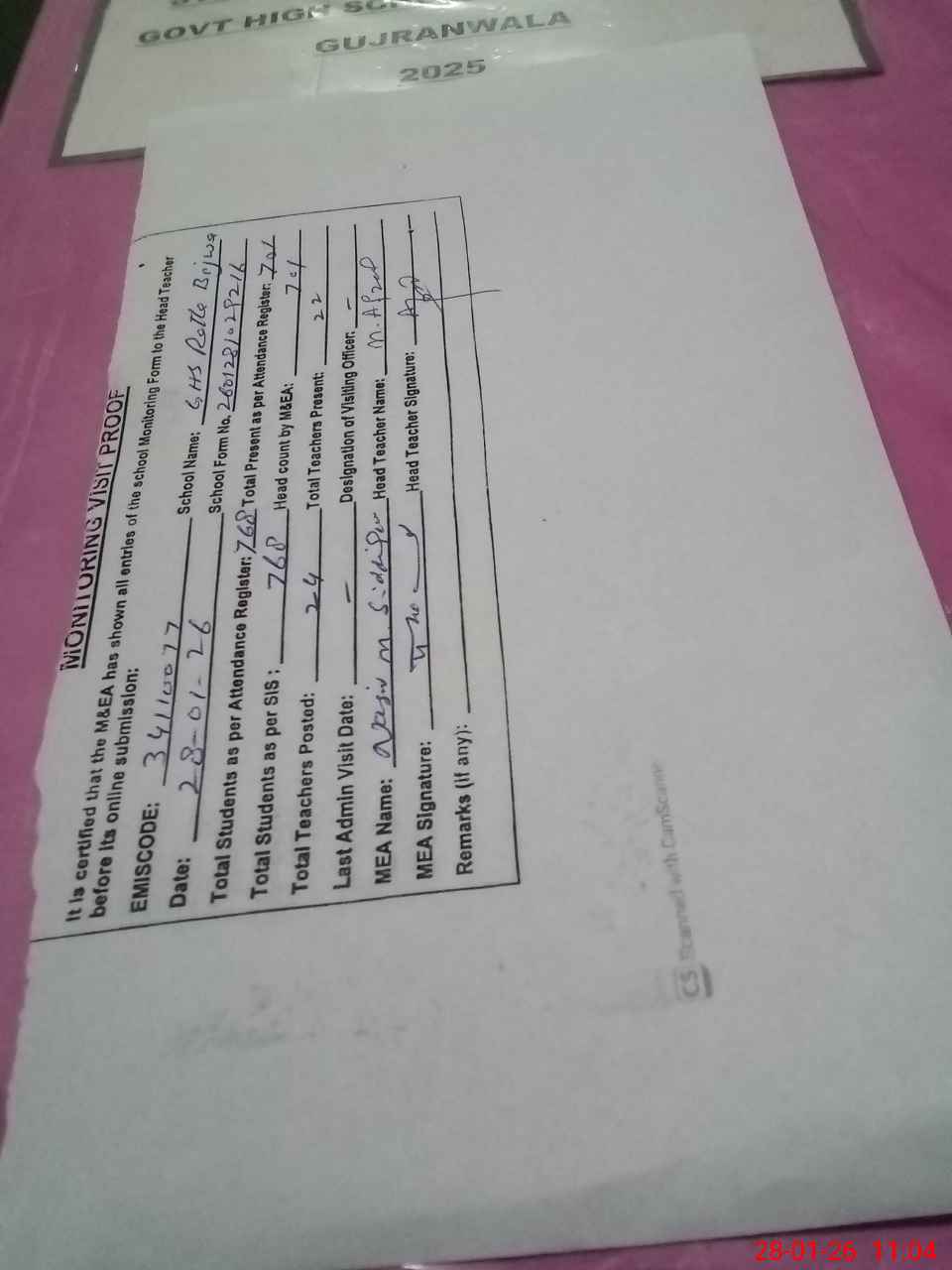 | Attendance Register | Head Teacher | MEA with School | Visit Proof |