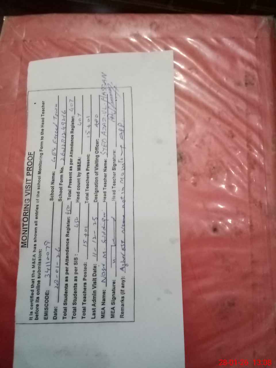 | Attendance Register | Head Teacher | MEA with School | Visit Proof |