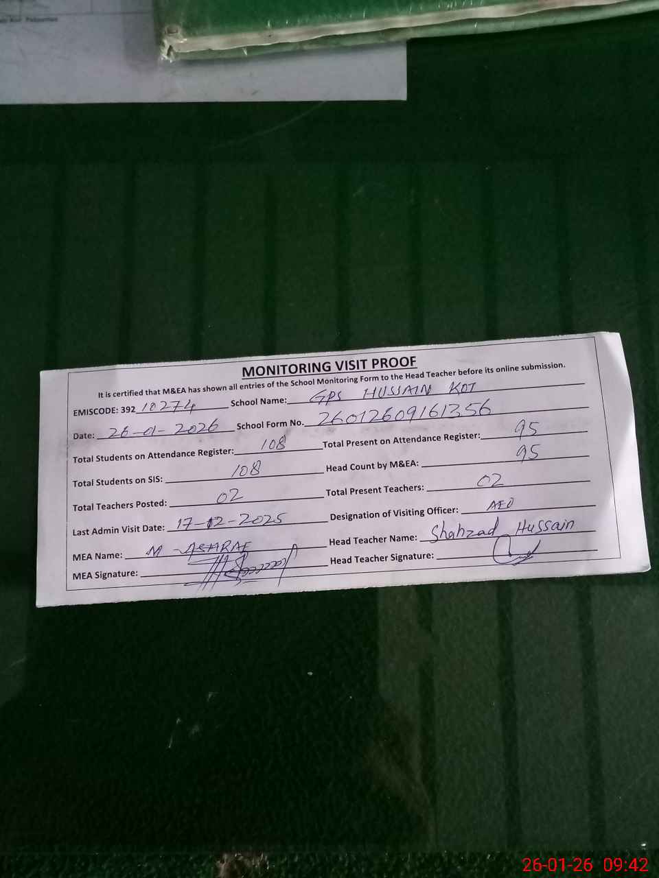 | Attendance Register | Head Teacher | MEA with School | Visit Proof |