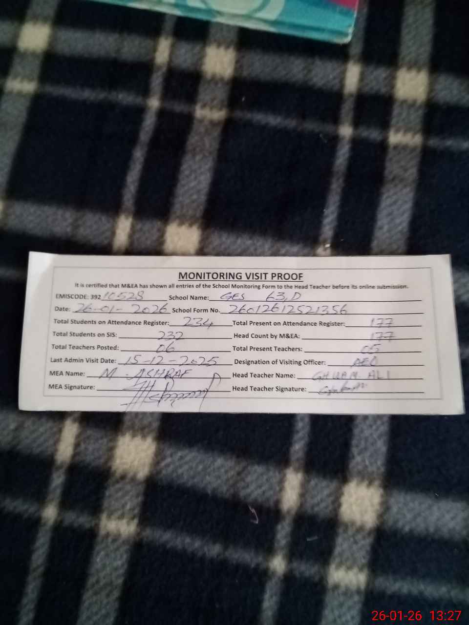 | Attendance Register | Head Teacher | MEA with School | Visit Proof |