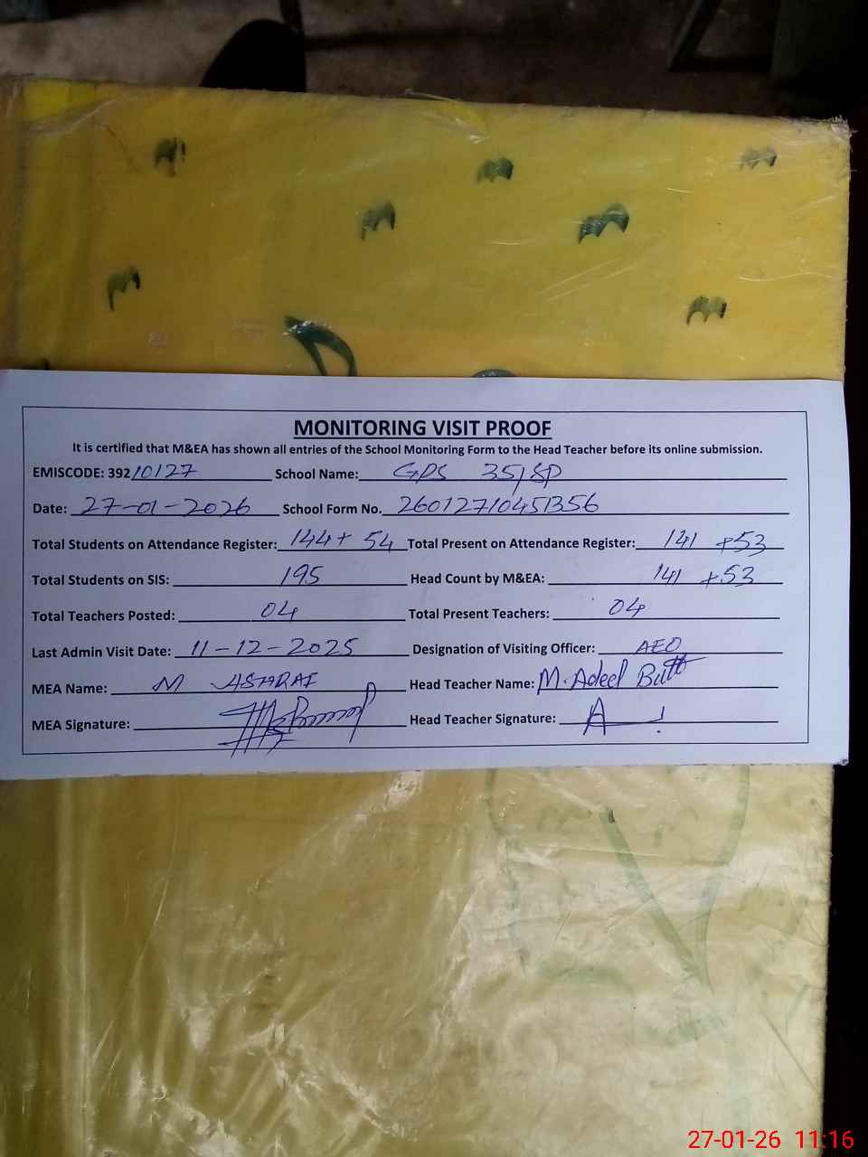 | Attendance Register | Head Teacher | MEA with School | Visit Proof |