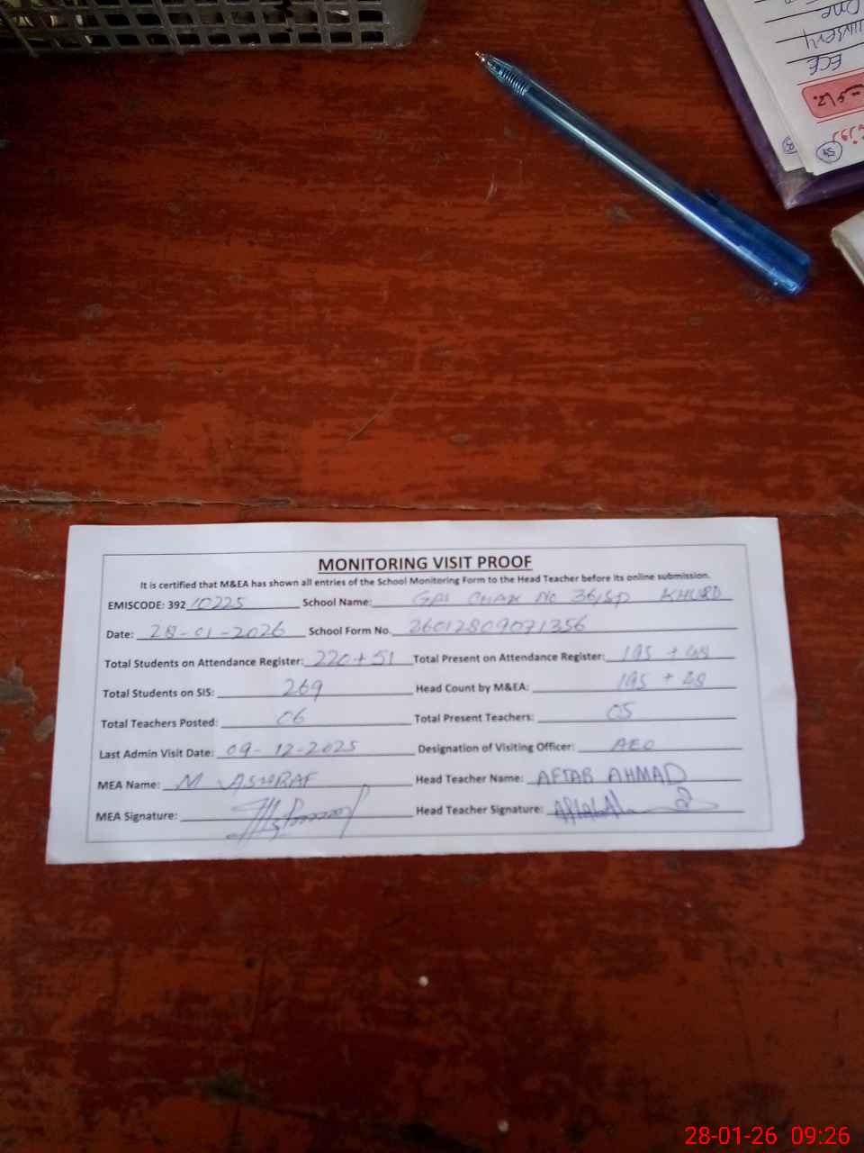 | Attendance Register | Head Teacher | MEA with School | Visit Proof |