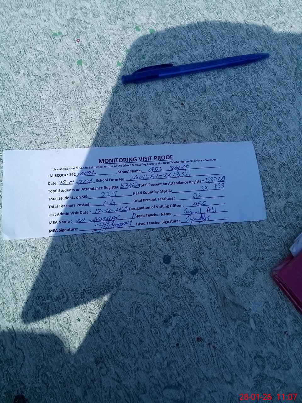| Attendance Register | Head Teacher | MEA with School | Visit Proof |