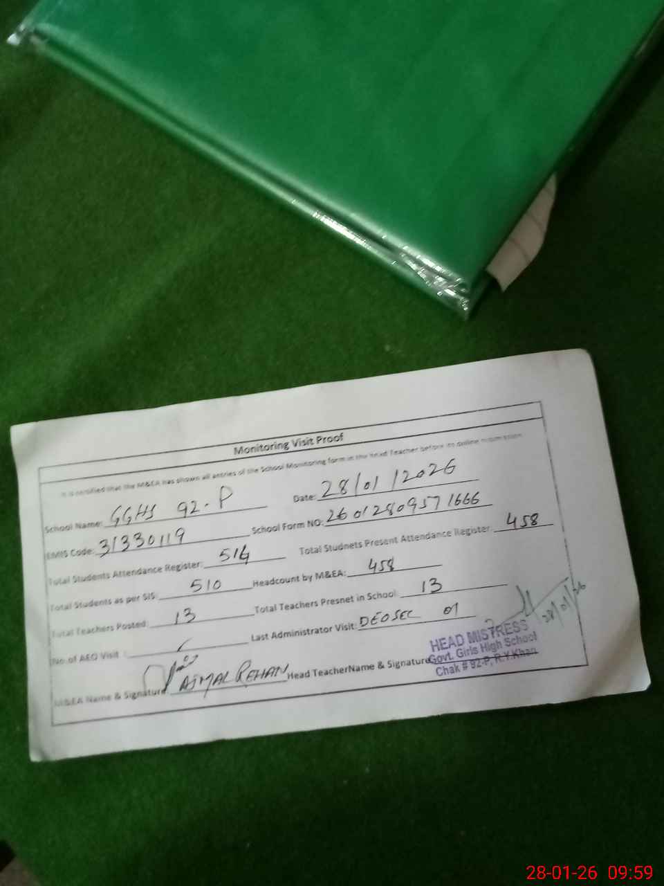 | Attendance Register | Head Teacher | MEA with School | Visit Proof |