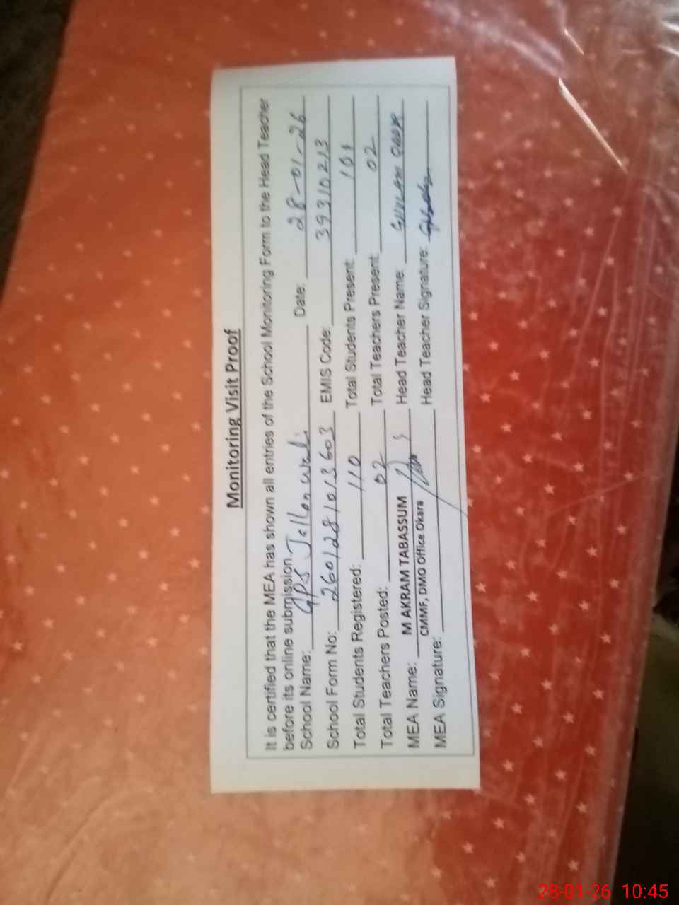 | Attendance Register | Head Teacher | MEA with School | Visit Proof |
