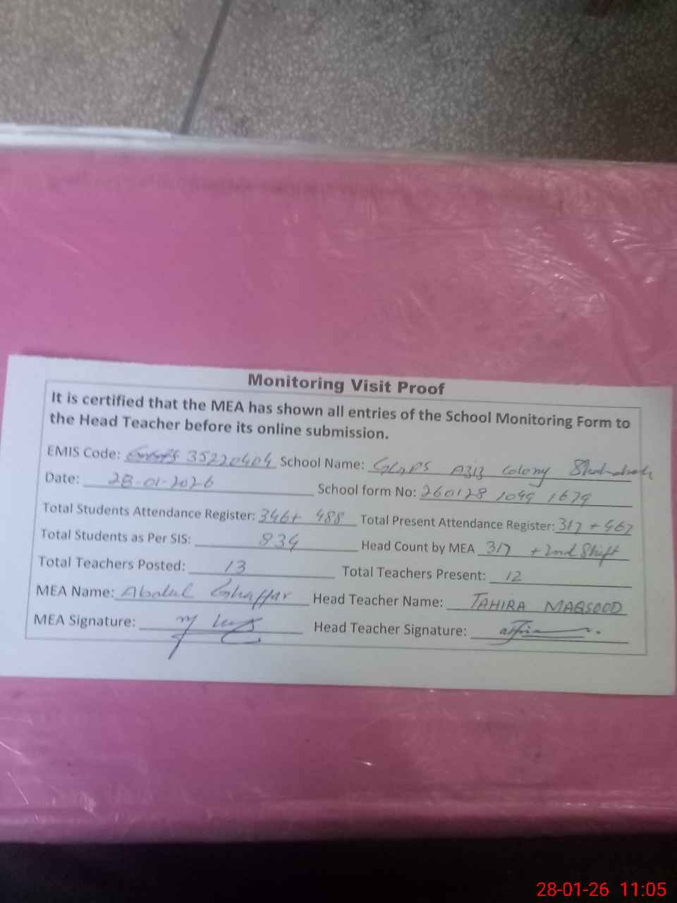 | Attendance Register | Head Teacher | MEA with School | Visit Proof |