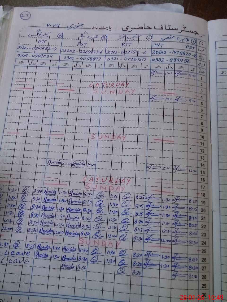| CNIC | Full Name | Designation | R/C | Absence during last cal. month |