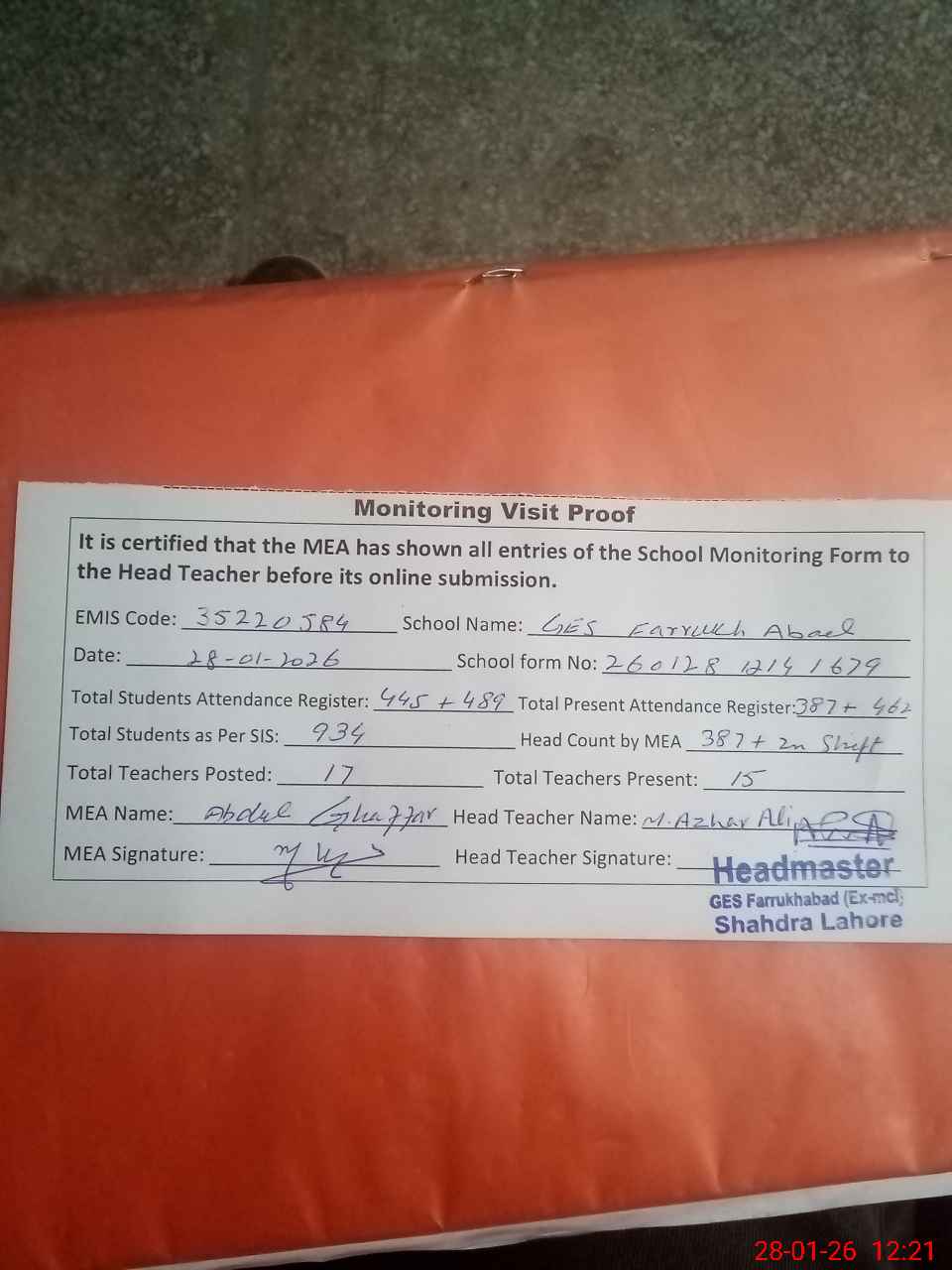 | EMIS Code: 35220584 | Name of School: GES FARRUKH ABAD SHAHDARA (EX-MCL) | |||