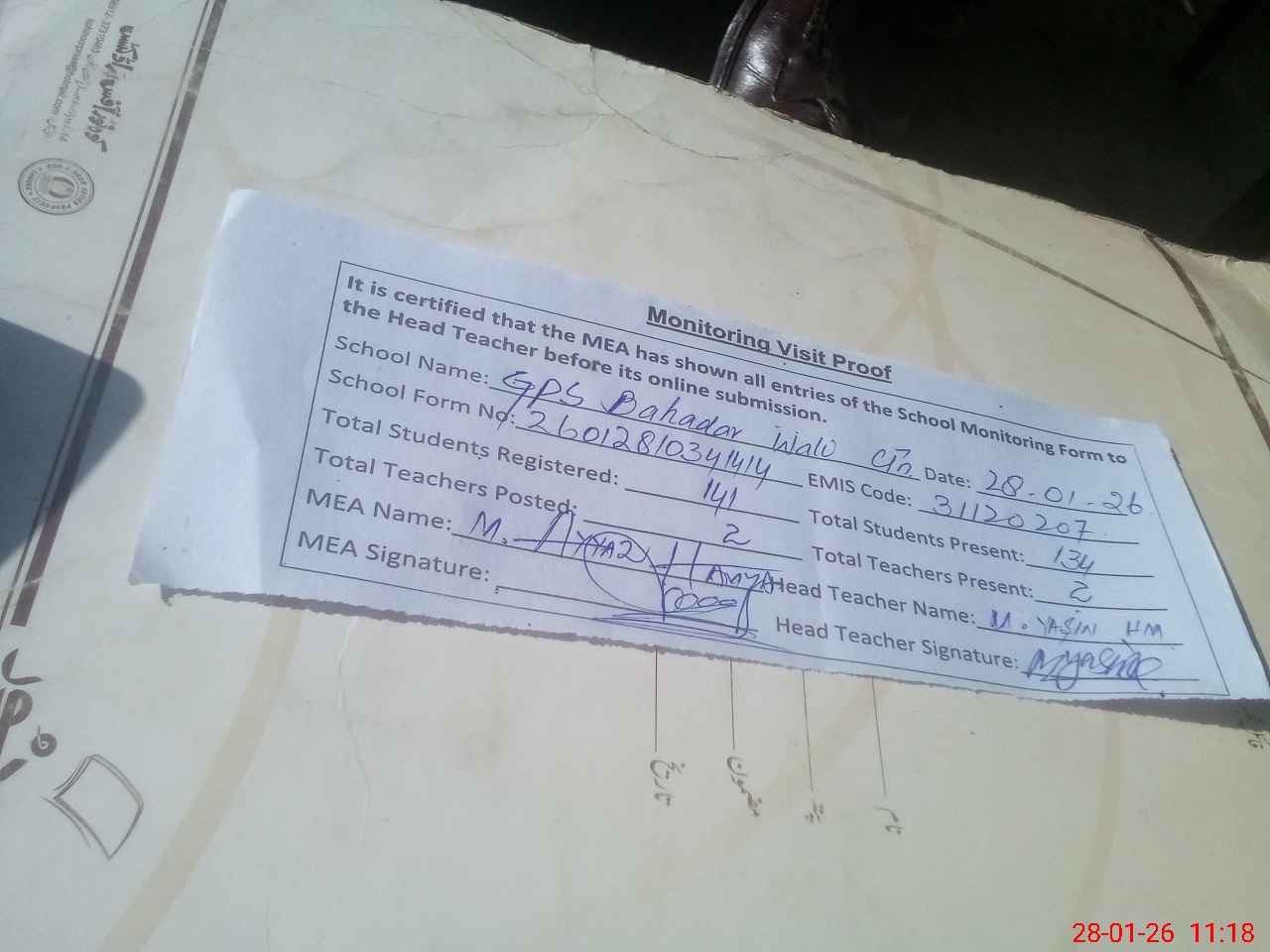 | EMIS Code: 31120207 | Name of School: GPS BAHADAR WALI | |||