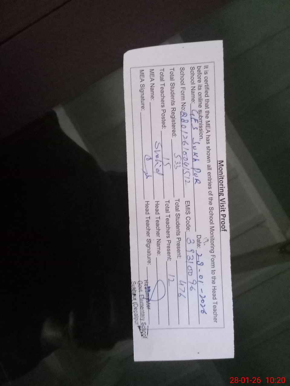 | Attendance Register | Head Teacher | MEA with School | Visit Proof |