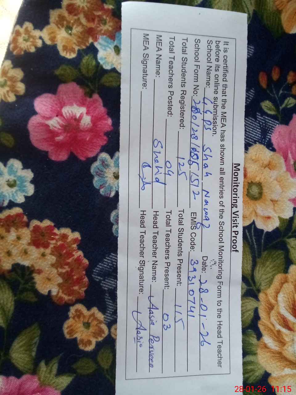 | Attendance Register | Head Teacher | MEA with School | Visit Proof |