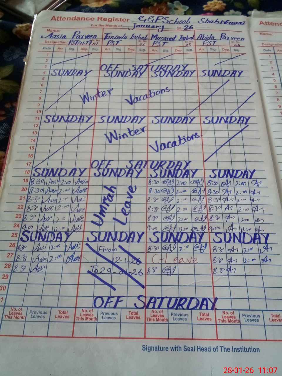 | Leave | Duty | Absent | Maternity | Medical | Ex- Pak |