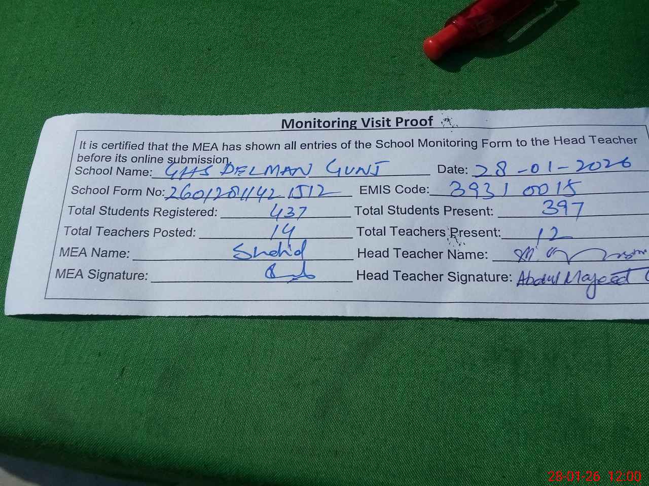 | Attendance Register | Head Teacher | MEA with School | Visit Proof |