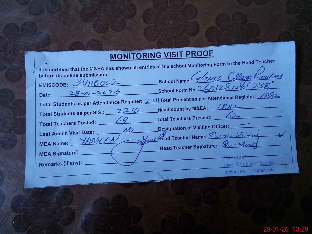 | Attendance Register | Head Teacher | MEA with School | Visit Proof |