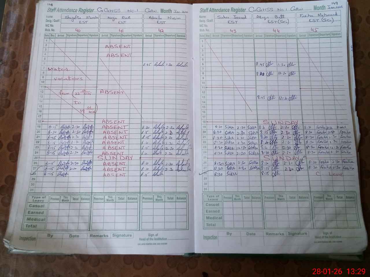 | Leave | Duty | Absent | Maternity | Medical | Ex- Pak |