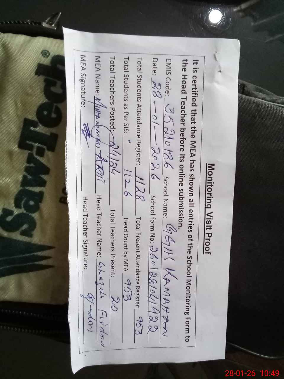 | Attendance Register | Head Teacher | MEA with School | Visit Proof |