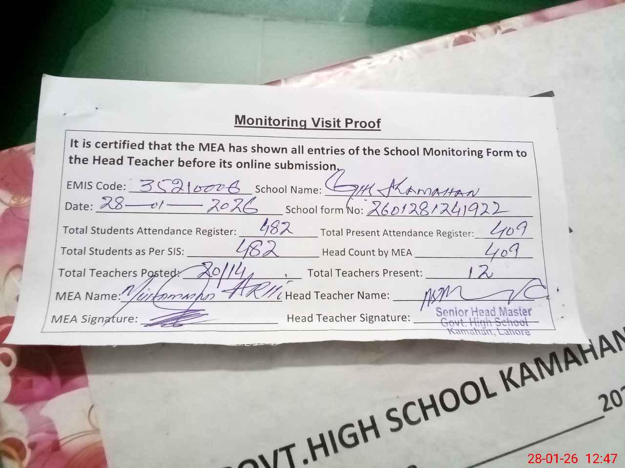 | Attendance Register | Head Teacher | MEA with School | Visit Proof |