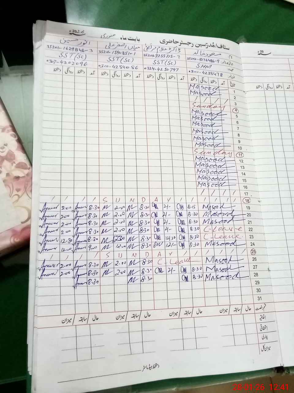 | CNIC | Full Name | Designation | R/C | Absence During Last Calender Month |