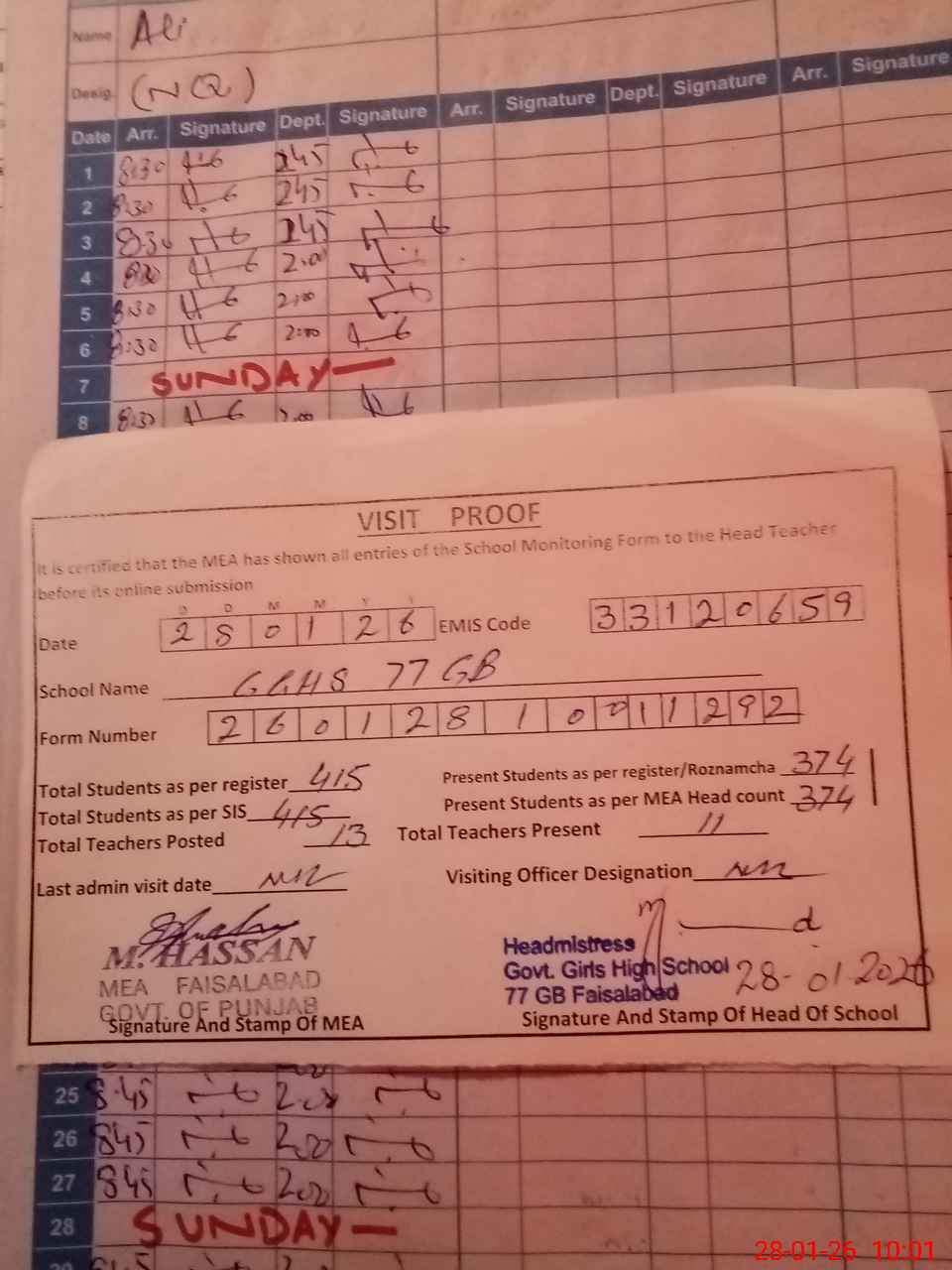 | Attendance Register | Head Teacher | MEA with School | Visit Proof |