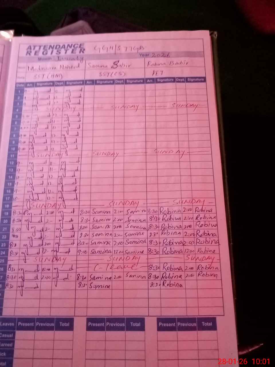 | CNIC | Full Name | Designation | R/C | Absence During Last Calender Month |