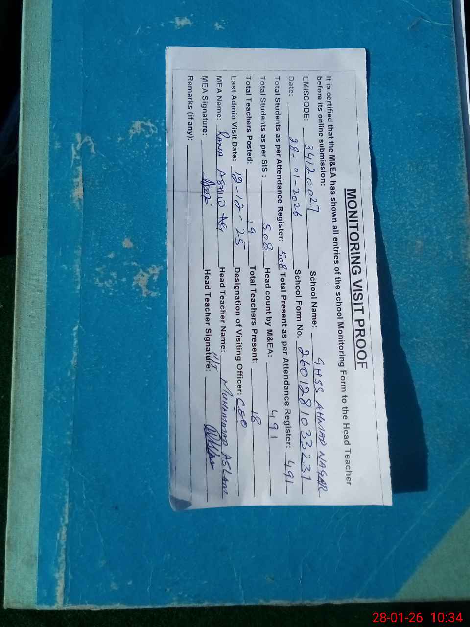 | Attendance Register | Head Teacher | MEA with School | Visit Proof |