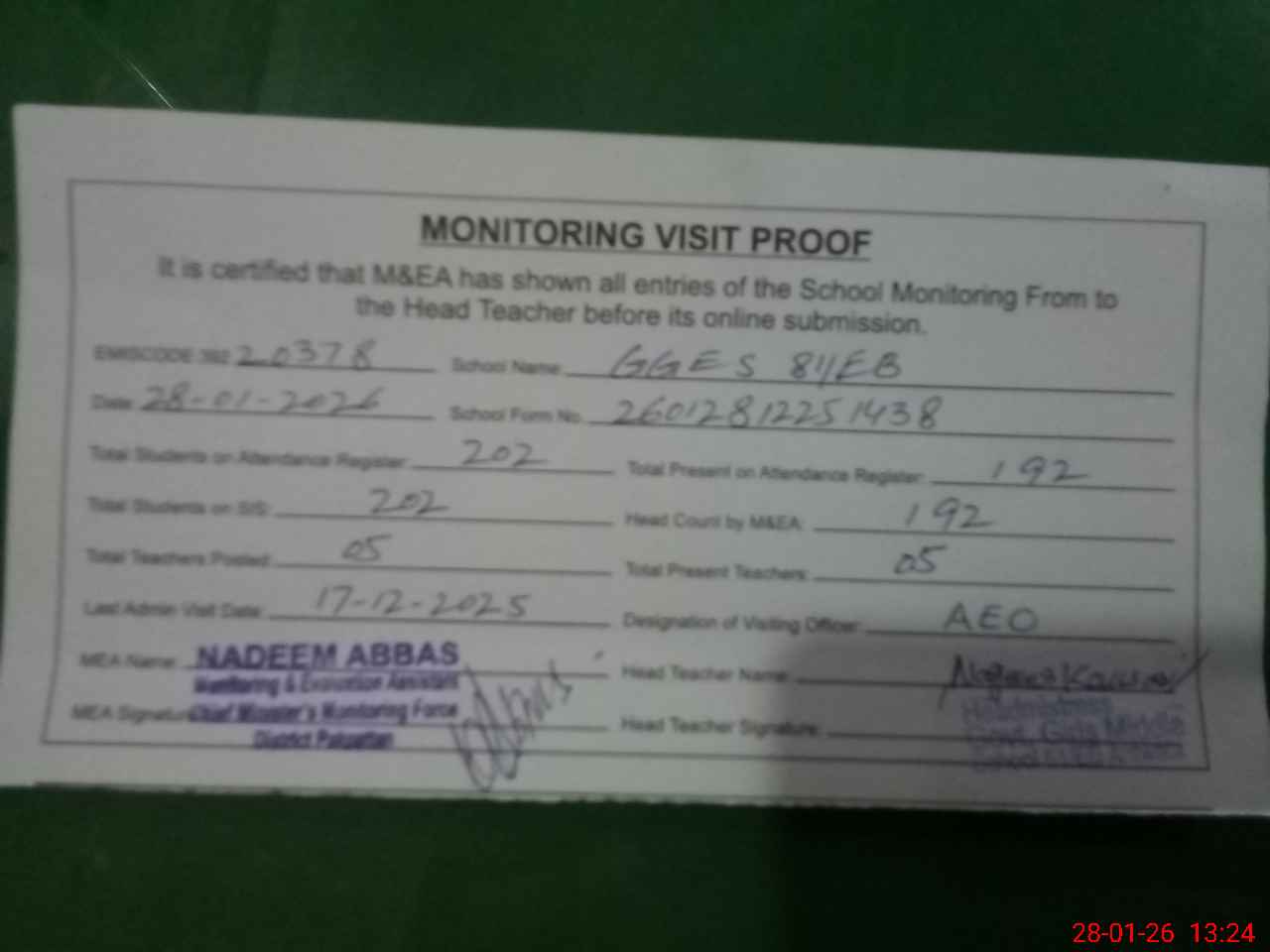 | Monitoring Date: 28-01-2026 | Start Time: 28-01-2026 12:25 PM | End Time: 28-01-2026 01:25 PM | Name of MEA: NA**** AB**** | |
