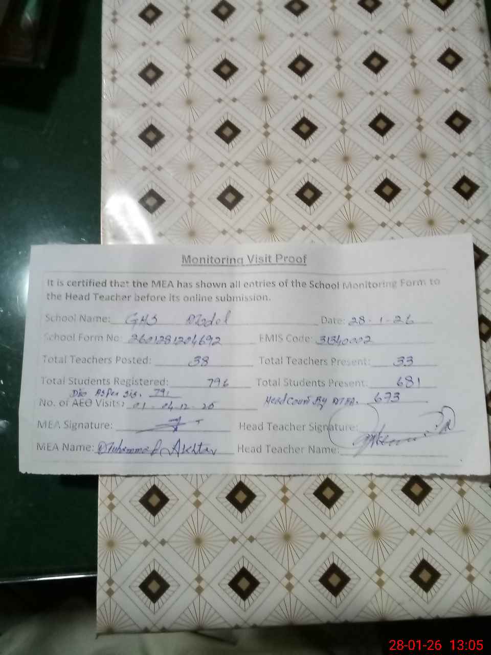 | Attendance Register | Head Teacher | MEA with School | Visit Proof |