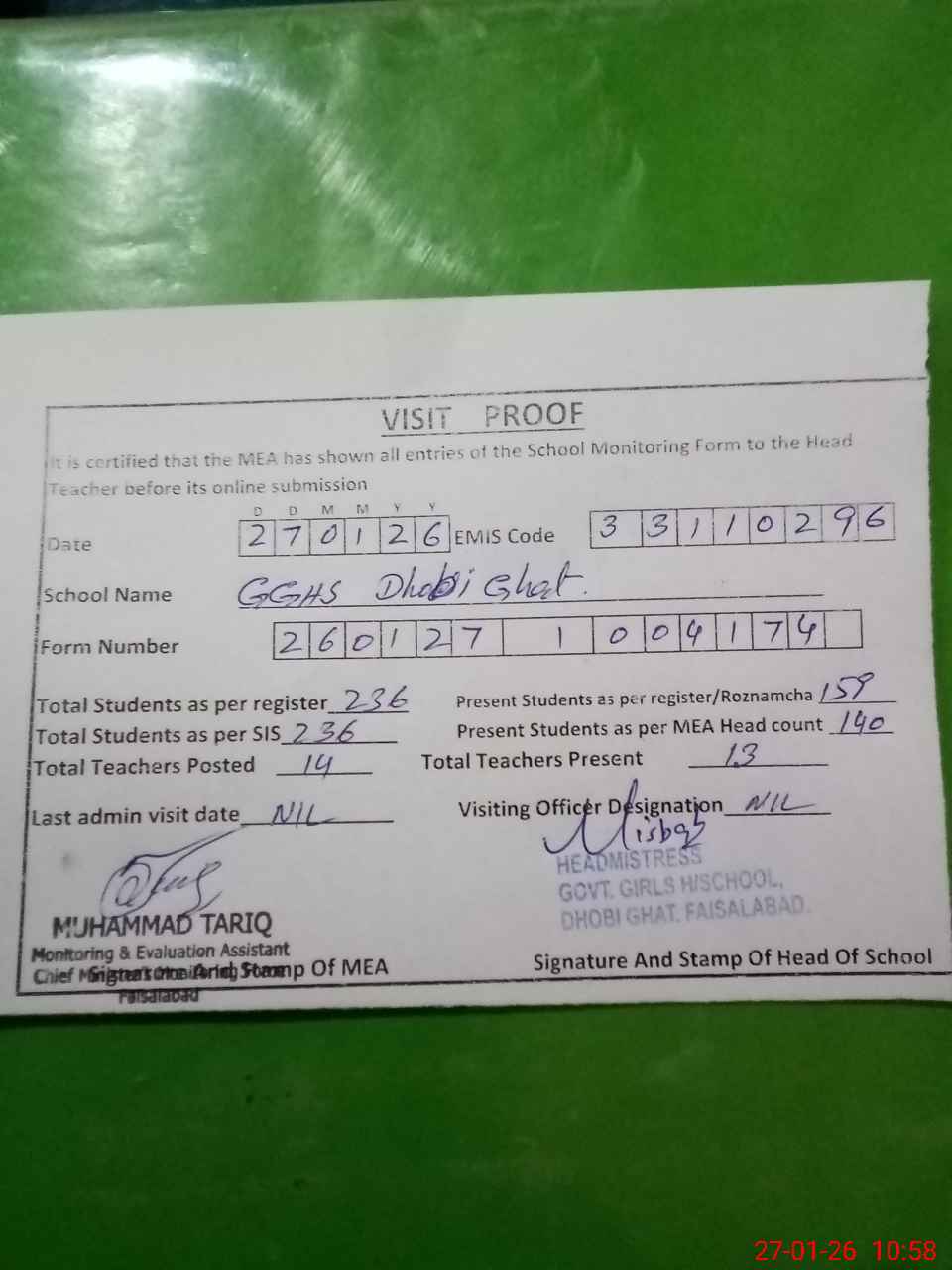 | EMIS Code: 33110296 | Name of School: GGHS DHOBI GHATT | |||