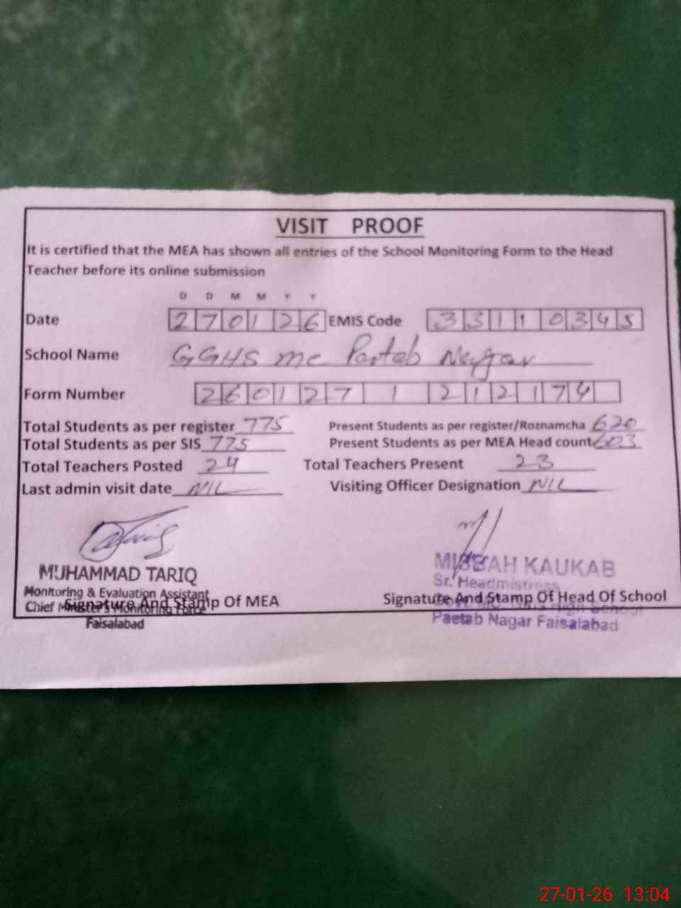 | EMIS Code: 33110345 | Name of School: GGHS MC PARTAB NAGAR FAISALABAD | |||