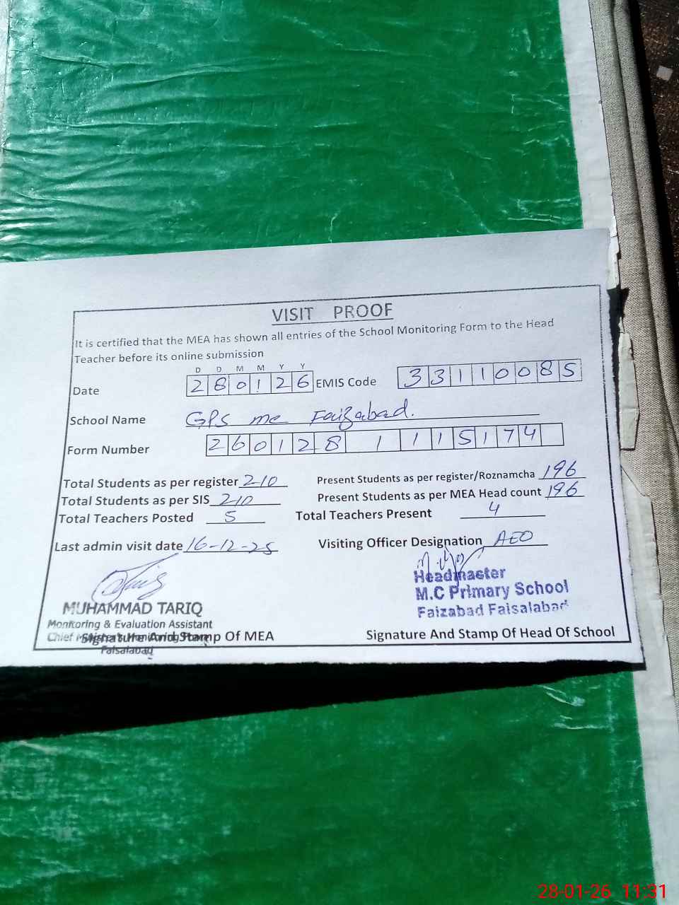 | Attendance Register | Head Teacher | MEA with School | Visit Proof |